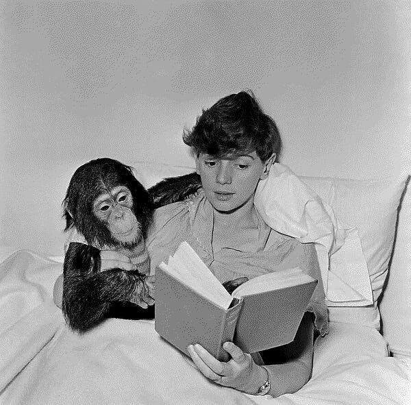 Jacquie’s book, Beasts in my Bed, is something of coda to her husband’s accounts; a wife’s-eye view of the dubious, dusty business of animal-sourcing, complete with patronizing footnotes from Gerald (“women do like to exaggerate” — GD). Back in Bournemouth, they kept the animals at home while they searched for a suitable site for what eventually became the Jersey Zoo. Bush-babies and squirrels cozied together in the garage and Cholmondely, a chimpanzee in diapers, slept in the Durrells’ bedroom, where he swung from the drapes and “learnt to accept light, noise, cigarette smoke and anything else without detriment to his health or well-being.” Okay.